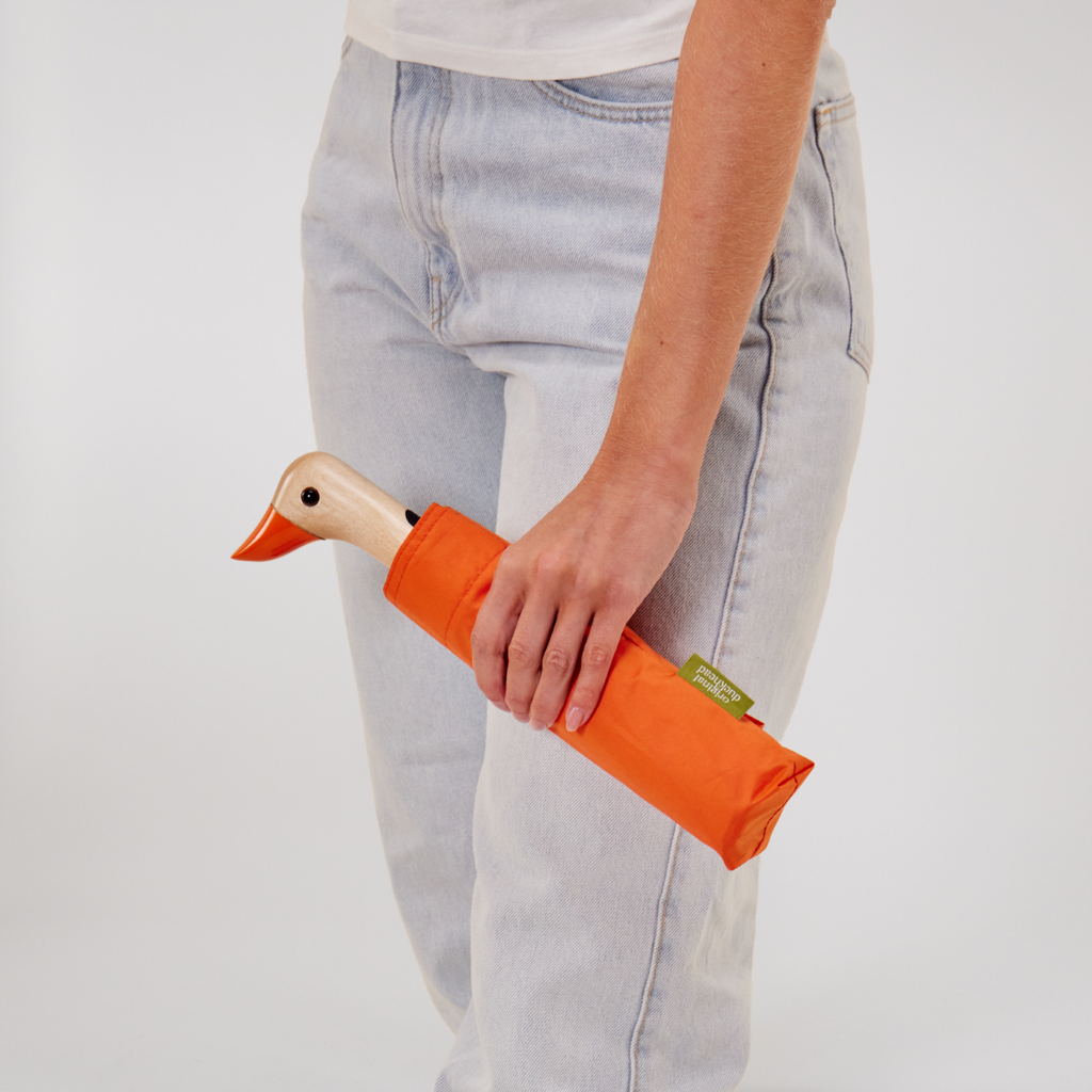Each canopy is made using 9 recycled plastic bottles, transforming post-consumer waste into a premium, water-resistant rPET fabric. The iconic duck-head handle is carved from one solid piece of sustainably sourced birch wood, giving every umbrella a unique natural grain and finish.