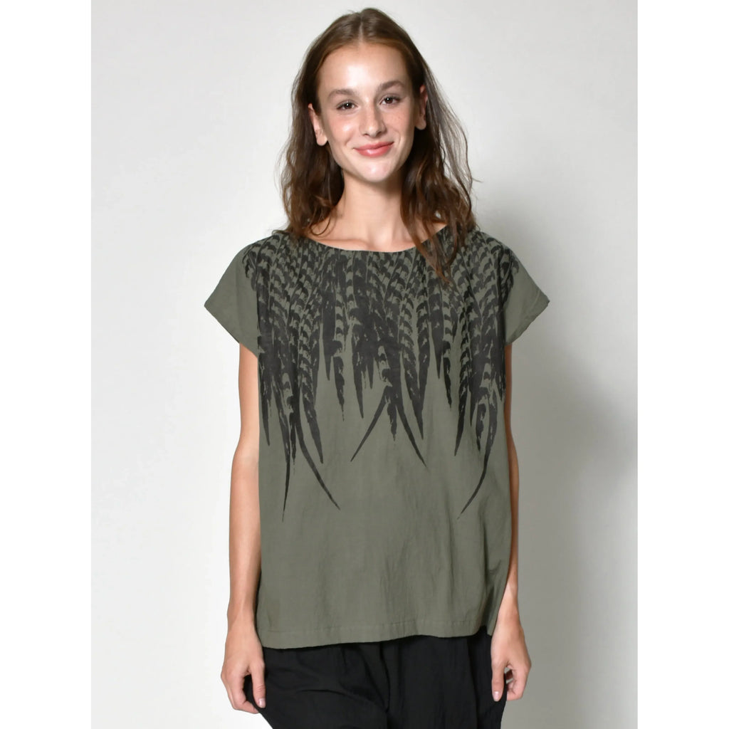 Make a statement with the Feather tunic in Army Green—a bold piece that lets you dress to express. Cut with a loose fit and finished with understated cap sleeves, its' simple design commands attention with its cool graphic feather print.