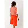 Two-tone textured sweater made from lightweight GOTS-certified organic cotton knit. It features a round neckline, 3/4-length sleeves, and ribbed trim at the neckline, cuffs, and hem. Orange.