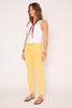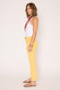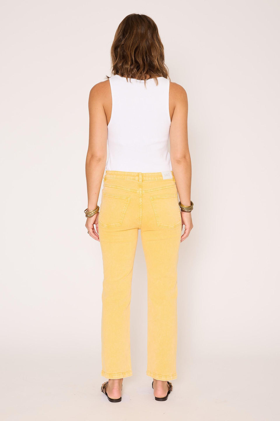 Garment dyed, curry yellow, crop flare jeans with a touch stretch. Super comfortable. Just slide on a pair sandals or your favorite sneakers and head to the park!