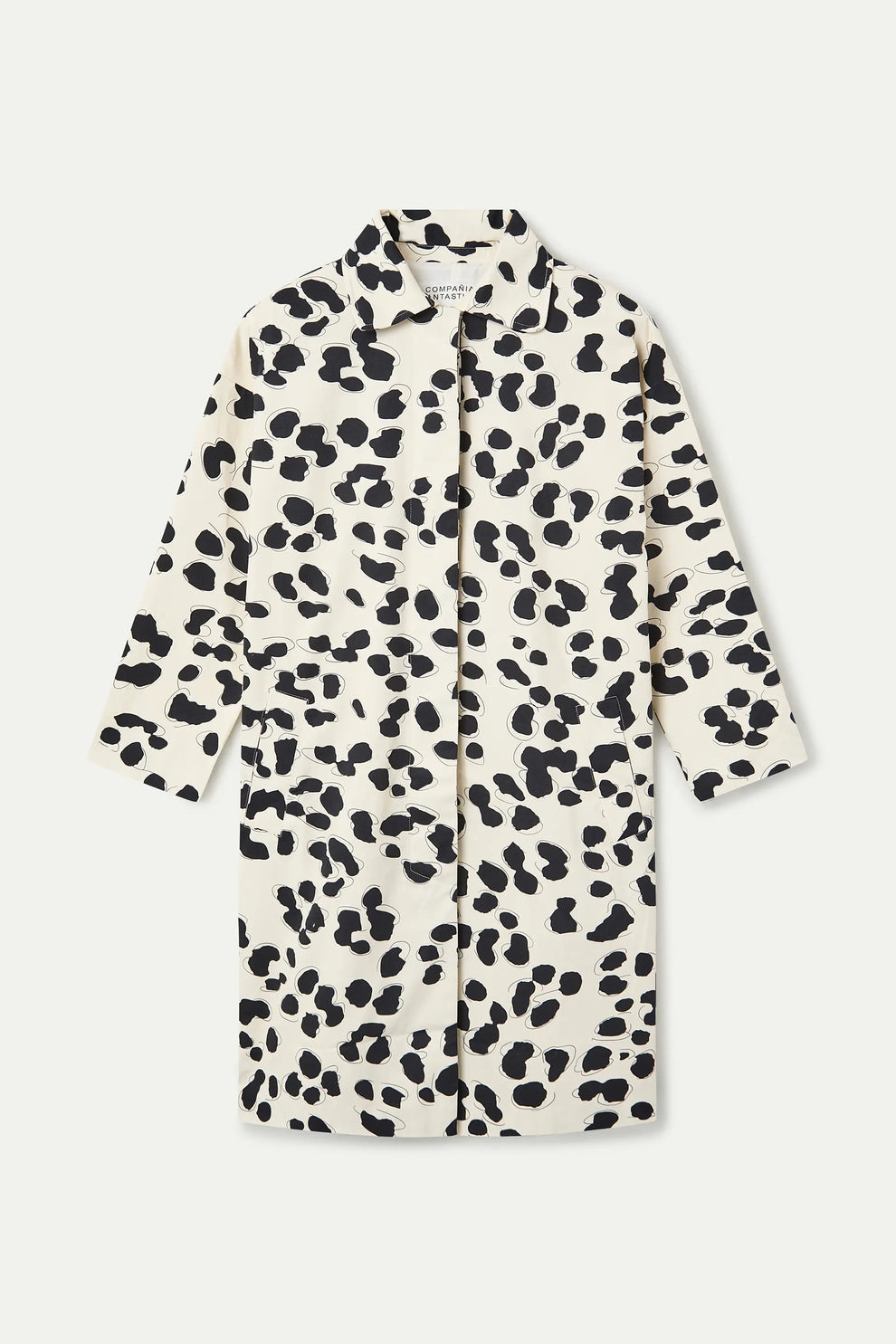 Trench coat in 100% cotton with a Dalmatian print. Lapel collar and long sleeves. Two-tone button front closure. Slightly dropped shoulders. Lined.