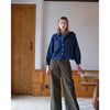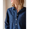 This boxy, cropped shirt is made in Bibico's classic heavyweight indigo denim. Its versatile shape means it can be worn alone or as an overshirt. Durable and timeless, this is Bibico’s take on a collared shirt. This season, it is available in five different fabrics. It pairs well with trousers or a skirt. Back yoke with full gather for shape. Full sleeves with buttoned cuffs. Contrast imitation shell buttons—two large front pockets.