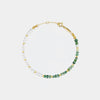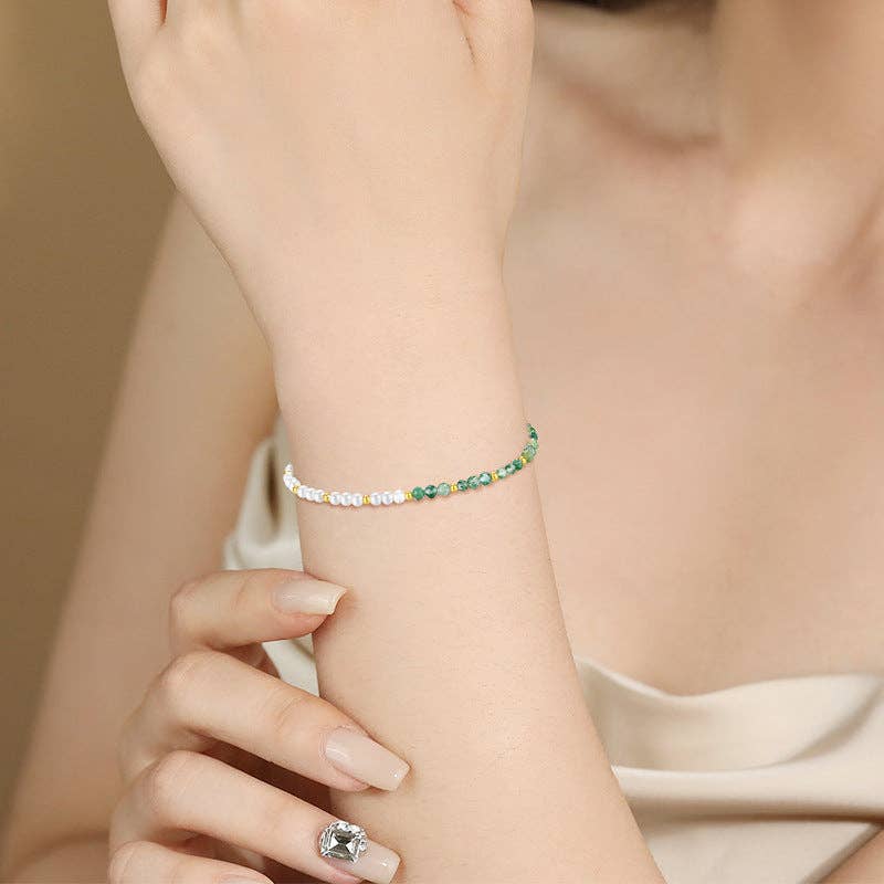 This moss agate pearl bead bracelet combines natural stone with refined craftsmanship. Each piece features distinctive moss agate patterns set in sterling silver, creating a sophisticated accessory with understated elegance.