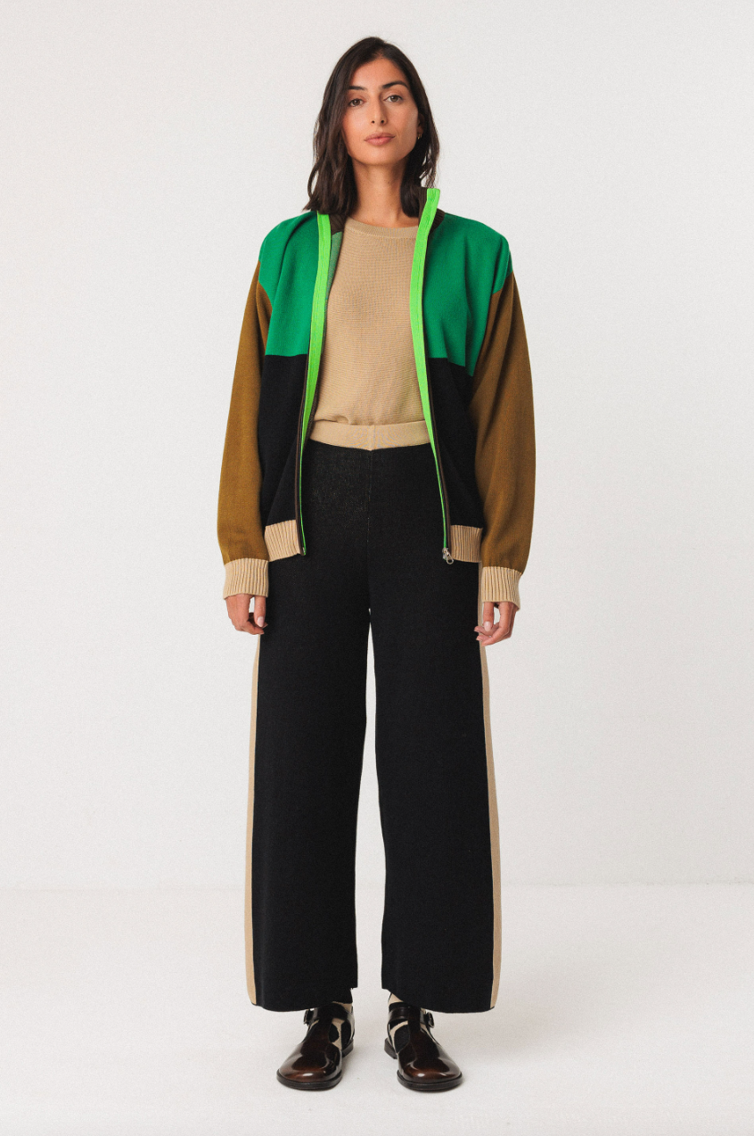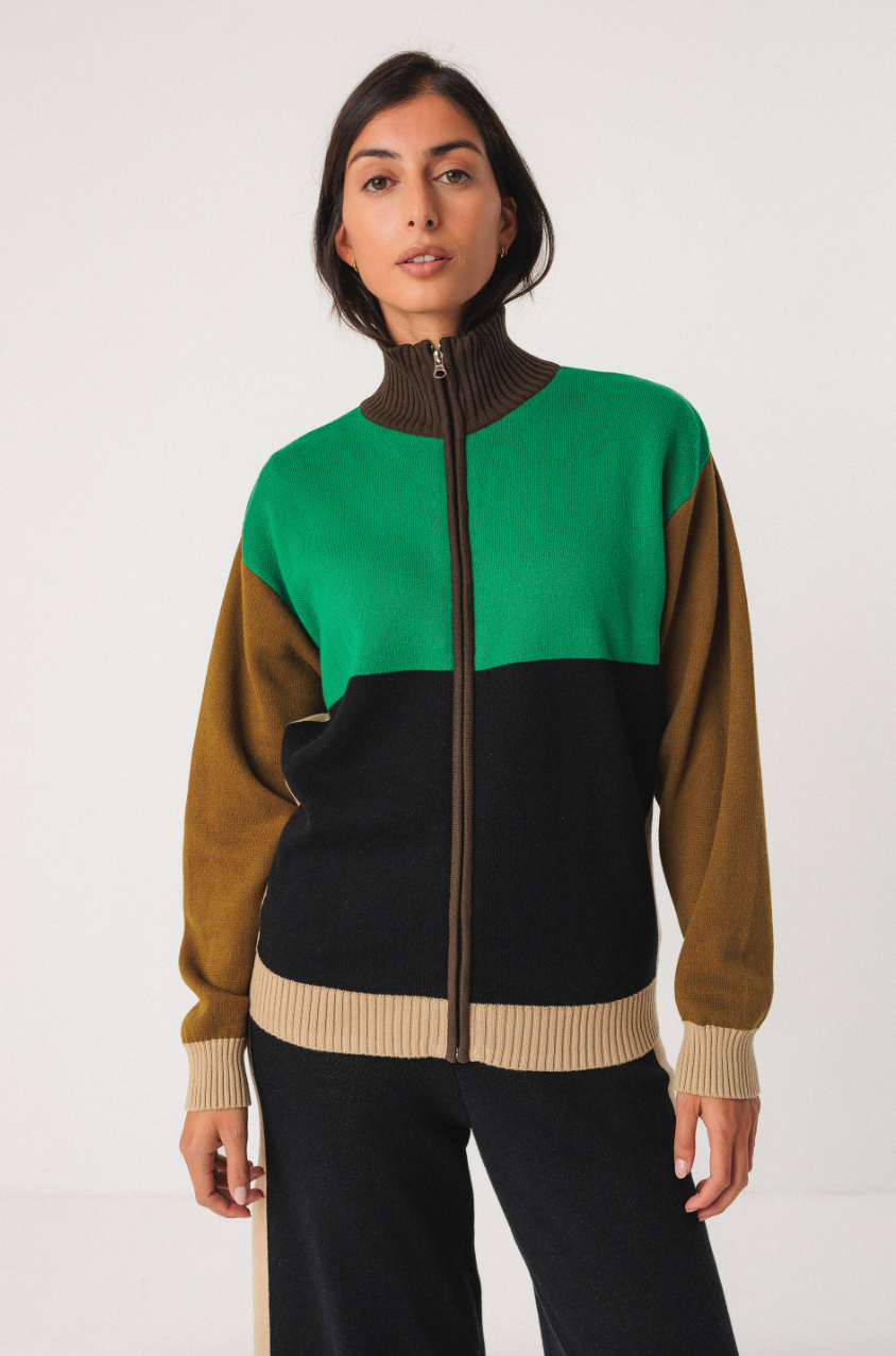 Sweater with stand-up collar and full front zip fastening. A medium weight knit, it has panels of contrasting colours.