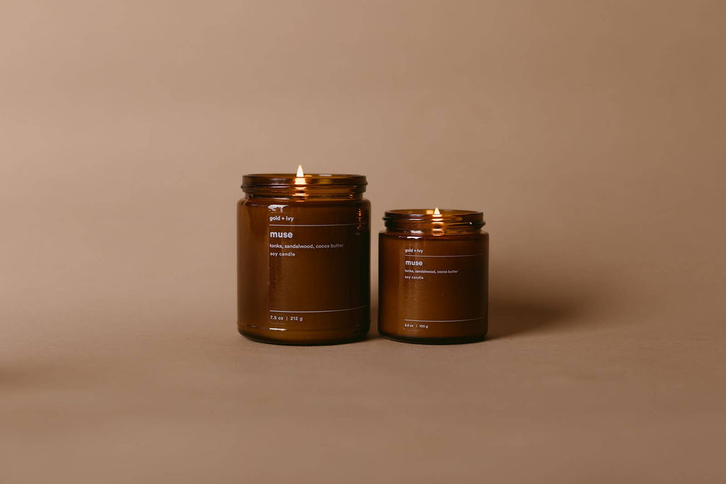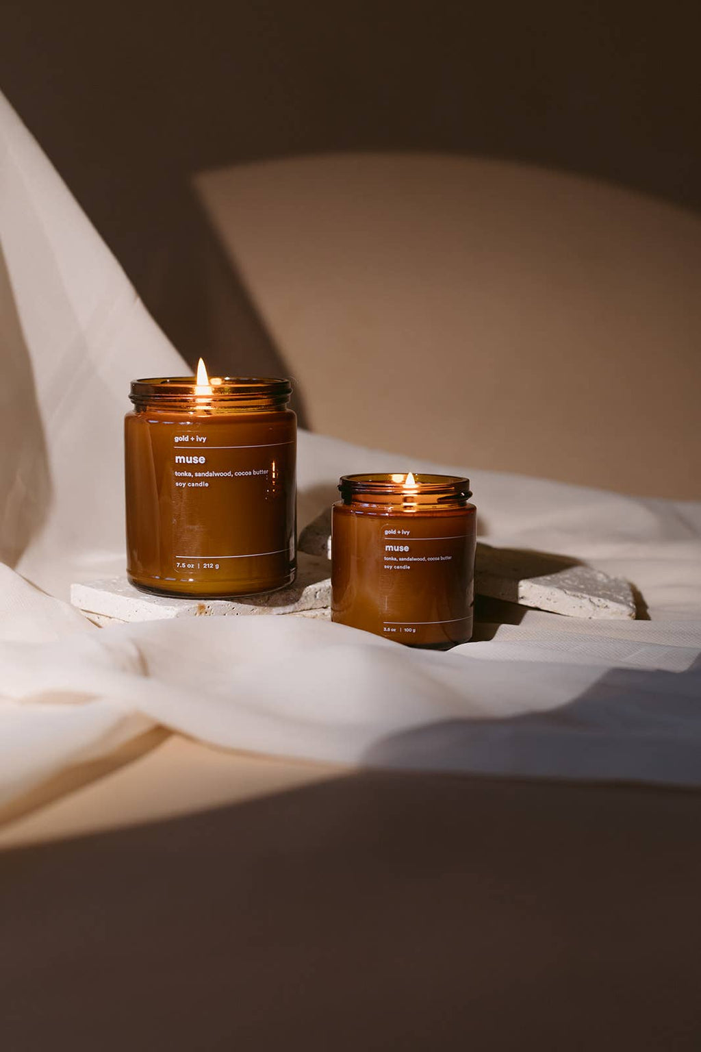 notes: tonka, sandalwood, cocoa butter delicate, sweet, romantic. Sweet decadent notes of rich cocoa butter blended with warm tonka is reminiscent of soft silk sheets against bare skin in the morning light. Your newest obsession. A new love that fills your thoughts through the day and drives you wild…Muse. Hand poured in Nashville, TN with 100% American-Grown soy wax, phthalate-free fragrance oils, essential oils, cotton wick, and amber glass jars. Always cruelty-free, paraben-free, lead-free, zinc-free, petroleum-free. 3.5 oz | Burn time: 20-25 hours | The mini candle is perfect for testing a new scent, or small spaces such as your desk or bathrooms. 7.5 oz | Burn time: 40-50 hours