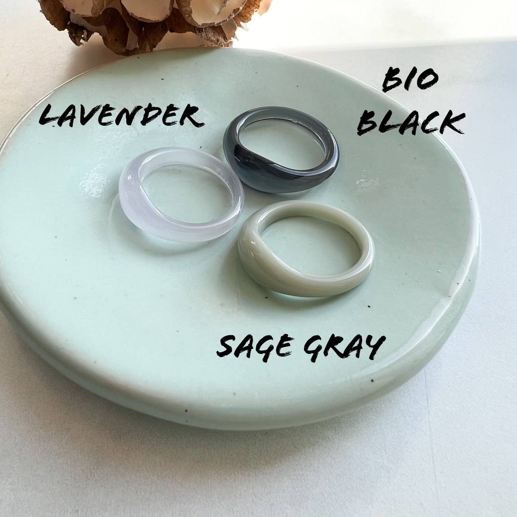 The Ruyi Dome Rings are made from cellulose acetate. A mixture of cotton pulp and acetic acid. It is a biodegradable and eco-friendly material. Acetate is lightweight yet durable. Sourced from Italy and Japan and then manufactured and finished in both China and Idaho. Fenna & Fei are a small, Woman-Owned business located in Boise.