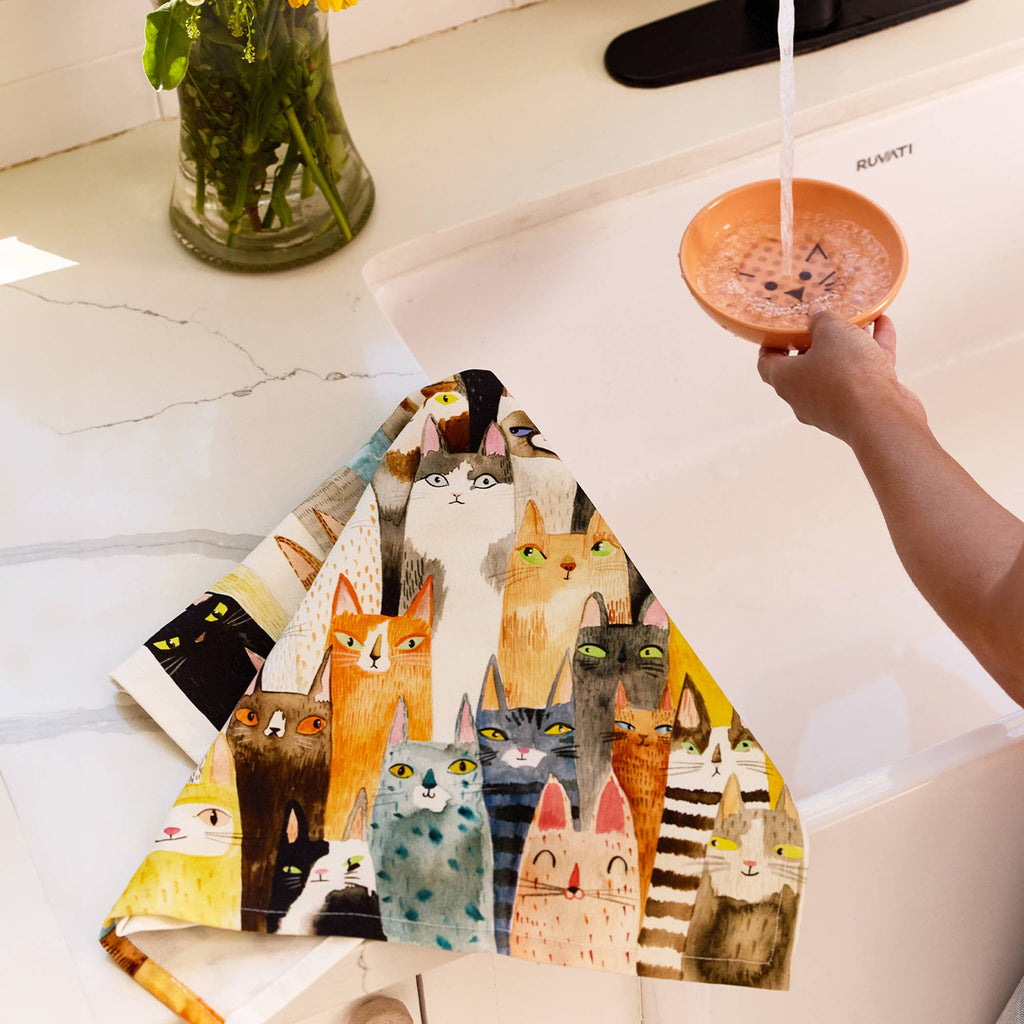 Art by Luka Va No two cats alike, each with their own personalities and attitudes, makes this 100% cotton towel a favorite with cat lovers young and old. Toss those icky kitchen towels that have outlived their usefulness and get your hands on these artistic cotton towels that are bursting with color. Whether for everyday use or a special occasion, there's a 100% cotton tea towel for everyone. Product Information * Unique art from our global artist community * 18" W x 28" H tea towel * 100% cotton * Machine washable * Full coverage print * Branded loop for hanging * Art created globally. Imported.