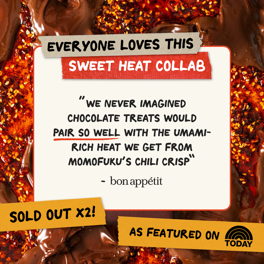 Enjoy this limited-edition chocolate collab by Momofuku and Raaka. Its savory and sweet, spicy and rich, with puffed quinoa crunch!