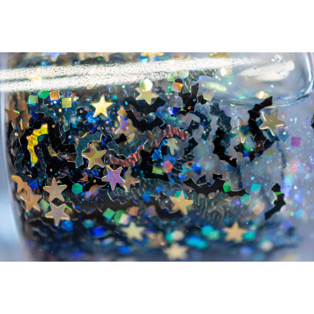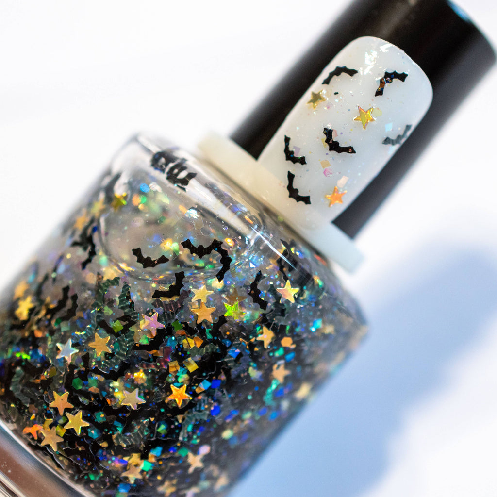 It’s Freakin’ Bats ~ Glow in the dark base, with iridescent glitters and small black bat glitters and gold stars 15mL standard large nail polish bottle size,