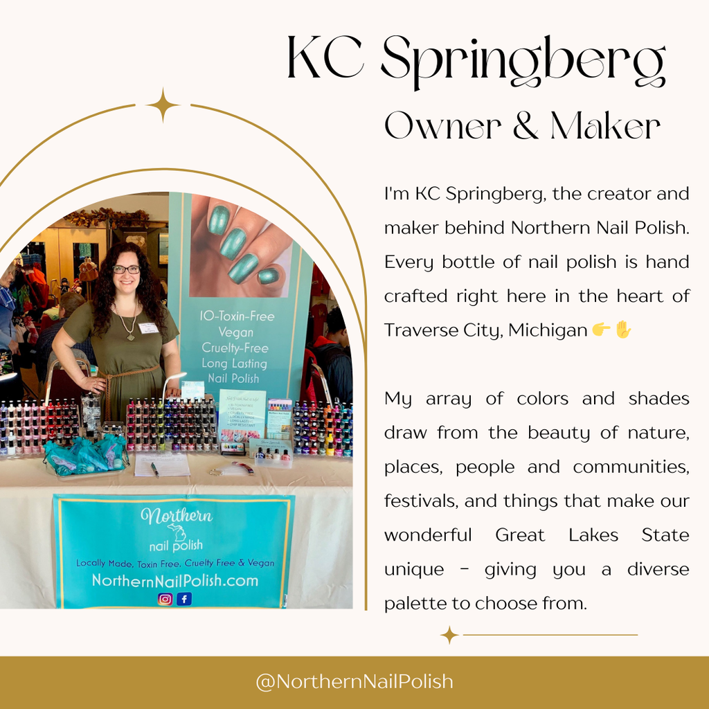 Northern Nail Polish: ~ Non-toxic ~ Natural, Vegan Ingredients ~ Cruelty-Free Formula ~ Chip-resistant & Long Lasting ~ Non-staining, Easily Removed ~ Handmade in Michigan