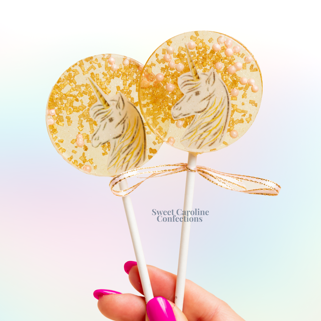 Crystal clear candy, a hand cut & painted unicorn, pink pearls and shimmery gold crystals. What more could you want?