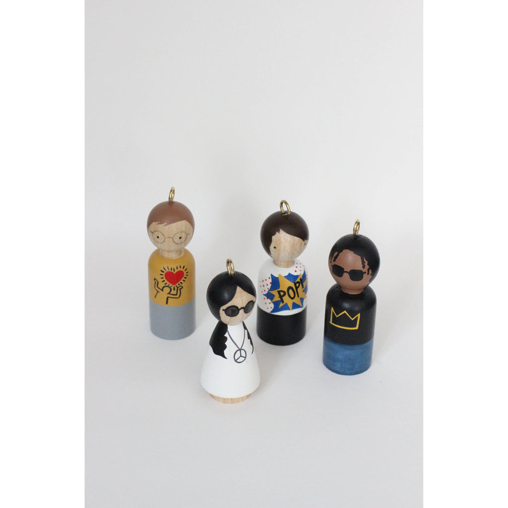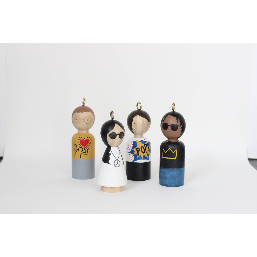 The ornament version of Grease Goose’s newest set! The Modern Artists 3 set features 4 dolls inspired by Jean-Michele Basquiat, Keith Haring, Yoko Ono, and Roy Lichtenstein. Each doll stands at 3" and is hand-turned on an electric lathe as well as hand-painted with non-toxic paints.