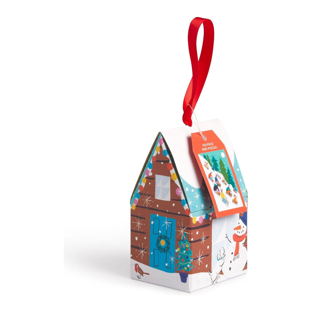 The Winter Sledding 130pc Puzzle Ornament illustrated by Louise Cunningham Starling, captures a snowy Christmas season, featuring a Christmas Alpine-themed house and a mini 130 piece winter sledding puzzle image.